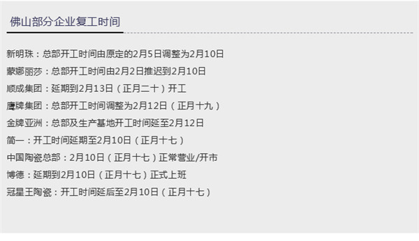 1月28日,广东省人民政府下发《关于企业复工和学校开学时间的通知》,要求各类企业复工时间不早于2月9日24时。据悉,佛山陶瓷企业严格按照规定,将复工时间延期到2月10日及以后。与原计划复工时间相比,广东陶企复工时间普遍延后一周左右。 1月29日,为加强新型冠状病毒感染肺炎疫情防控工作,有效减少人员聚集、阻断疫情传播,江西省人民政府向全省各市、县(区)及各部门下发紧急通知:江西省区域内各类企业不早于2020年2月9日24时前复工。 1月29日,山东省人力资源和社会保障厅印发《关于延迟省内企业复工的紧急通知》,除必需外,省内各类企业不早于2月9日24时前复工。 据了解,当前除少数陶企春节未停产外,山东地区陶企大都处于假期延长阶段。而往年,复产企业早的在初六、初七,晚的到元宵节前后,都会点火开工,甚至很多陶企元宵节前后就已出砖。 多位山东陶企负责人看来,今年陶企晚开工将成为普遍事实。据了解,由于年前停产较晚,淄博还有多家陶企检修尚未完成,尤其是一些涉及窑炉改造的陶企。由于多数窑炉改造工人多来自湖北黄冈等地,因此从目前来看,湖北省黄冈处于疫情集中区域,估计这部分企业员工很难在短期内到岗。 |